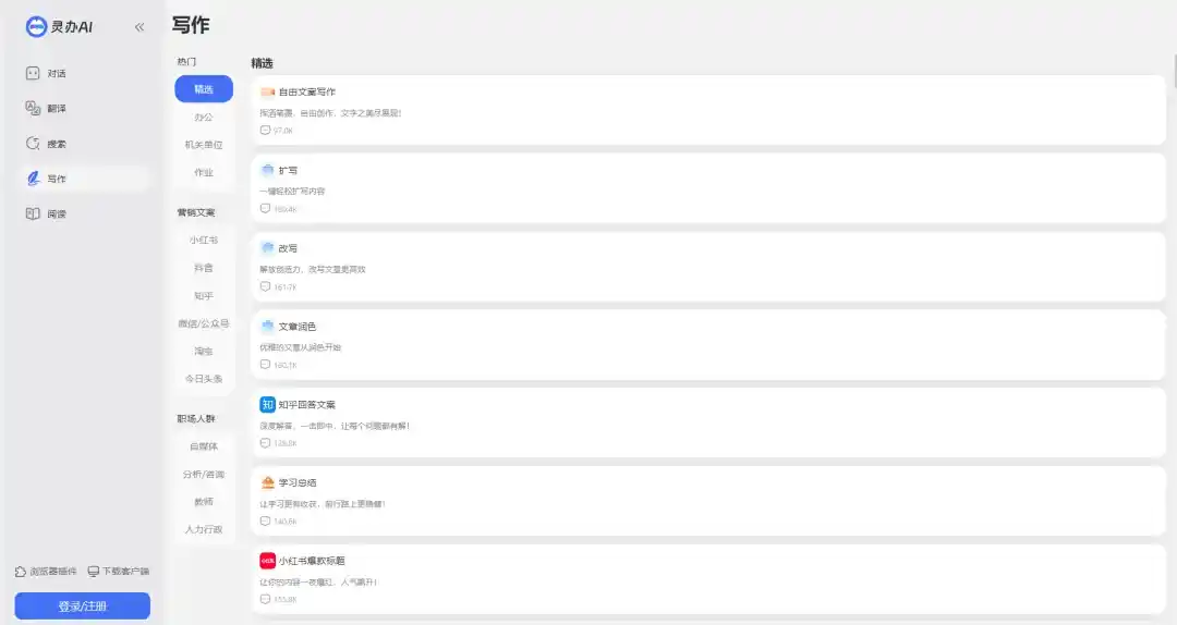 灵办AI可以高效的创作内容,无论是文章、标题、句子、还是短文,都能迅速生成,选择你需要的场景,即可高质量输出!