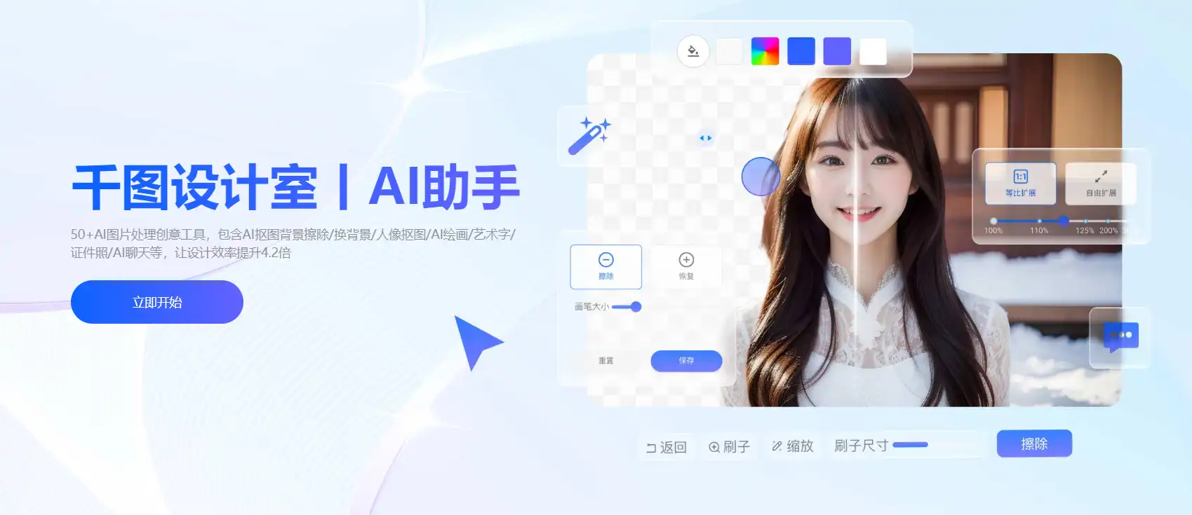 - 全能设计助手:该产品提供了无损放大、背景擦除、透明图片背景擦除、AI多彩背景、AI批量背景擦除等众多实用工具。